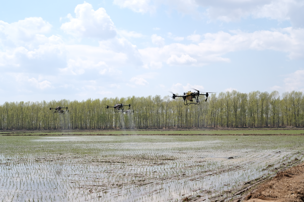 2023年5月,北大荒集團(tuán)軍川農(nóng)場有限公司正使用植保無人機(jī)對剛剛插秧的地塊噴施液態(tài)返青肥。新華社記者黃騰 攝