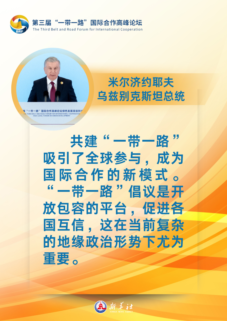 多位外國領(lǐng)導人和國際組織負責人18日在北京出席第三屆“一帶一路”國際合作高峰論壇時表示,高度認同習近平主席發(fā)表的主旨演講,對習近平主席宣布的支持高質(zhì)量共建“一帶一路”八項行動感到非常鼓舞。他們認為,“一帶一路”倡議有力促進各國共同發(fā)展,愿繼續(xù)深化合作,推動共建“一帶一路”取得更高質(zhì)量、更高水平的新發(fā)展,攜手打造下一個“金色十年”。