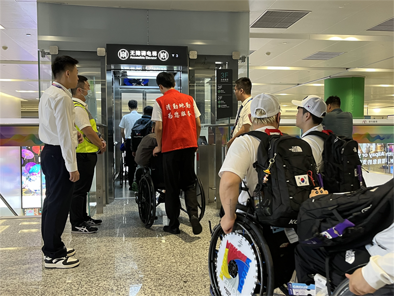 一路上,殘疾運(yùn)動(dòng)員沒有遇到一個(gè)臺(tái)階。廊橋口的無障礙電梯、流線上的無障礙坡道、清晰的標(biāo)識(shí)標(biāo)牌、隨處可見的低位飲水機(jī)及服務(wù)柜臺(tái),完善的無障礙設(shè)施,都為殘疾運(yùn)動(dòng)員創(chuàng)造了便利的出行環(huán)境。抵離工作人員和志愿者全程的暖心陪伴,更是讓抵達(dá)流程“加速”與“升溫”。