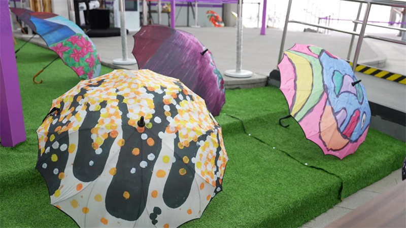 亞殘運(yùn)場館、中國元素、飛飛形象、杭城美景……這些畫作和手工制品內(nèi)容豐富、形態(tài)各異,有各類繪畫、傘面彩繪、盤繪、剪紙、黏土制品等等,鮮亮的色彩搭配相當(dāng)搶眼,讓人一看就心情愉悅。