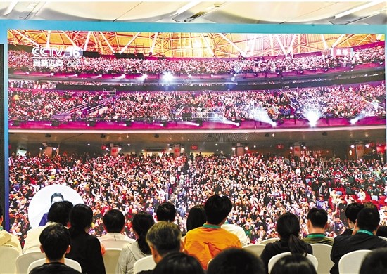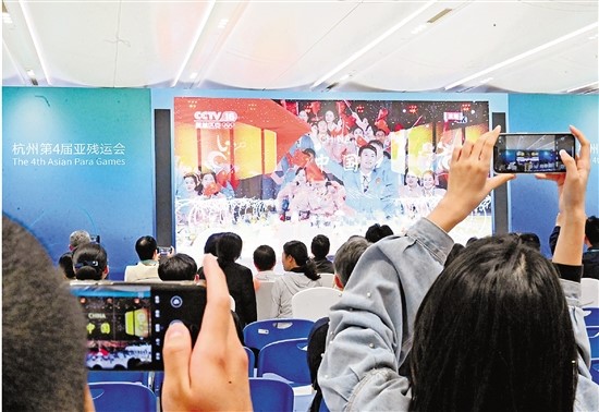 10月22日晚,杭州第4屆亞殘運會主媒體中心,中外媒體記者一起收看、報道亞殘運會開幕式。圖為中國代表團入場,大家舉起手機拍攝。記者 徐彥 攝