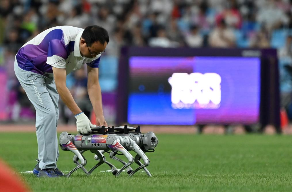 10月1日,在杭州亞運(yùn)會(huì)田徑女子鐵餅決賽前,一名工作人員將鐵餅放在用來(lái)搬運(yùn)鐵餅的機(jī)器狗上。新華社記者江漢攝