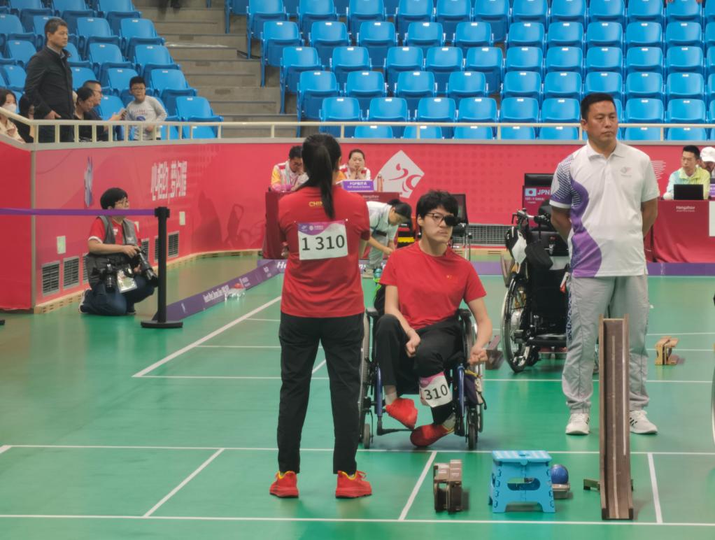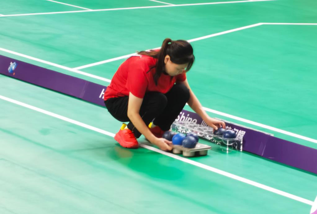 硬地滾球是最具包容性的殘疾人運(yùn)動(dòng)之一,專門為腦癱患者、嚴(yán)重軀體功能障礙的運(yùn)動(dòng)員而設(shè)立。其根據(jù)運(yùn)動(dòng)員殘疾程度分為4個(gè)級(jí)別,楊貝貝屬于其中較重的級(jí)別,無法獨(dú)立擲球,因此需要軌道器械和競賽輔助人員的幫助。