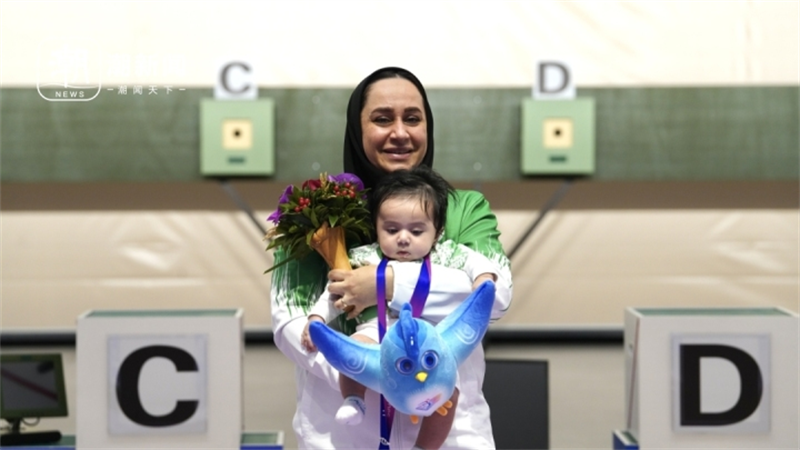 10月24日傍晚,富陽銀湖體育中心,杭州亞殘運(yùn)會(huì)射擊項(xiàng)目SH1級女子10米氣手槍頒獎(jiǎng)儀式上,銀牌得主、杭州亞殘運(yùn)會(huì)伊朗代表團(tuán)射擊運(yùn)動(dòng)員薩雷赫?賈萬馬爾迪一出場,就引得現(xiàn)場一片歡呼。