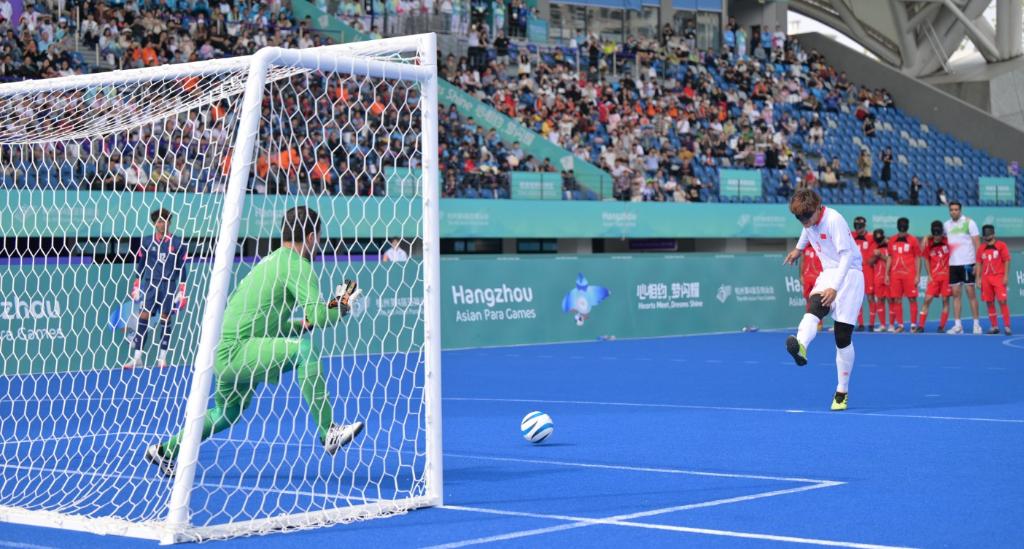 10月28日,中國(guó)隊(duì)球員劉猛(中)在盲人足球決賽中射門,中國(guó)隊(duì)在點(diǎn)球大戰(zhàn)中以2:1戰(zhàn)勝伊朗隊(duì)奪冠。新華社記者才揚(yáng)攝