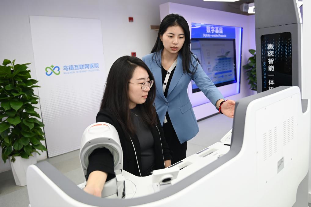 11月7日,參觀者在烏鎮(zhèn)互聯(lián)網(wǎng)醫(yī)院體驗智能一體機的體檢功能,并與醫(yī)生進行視頻連線。 新華社記者黃宗治 攝