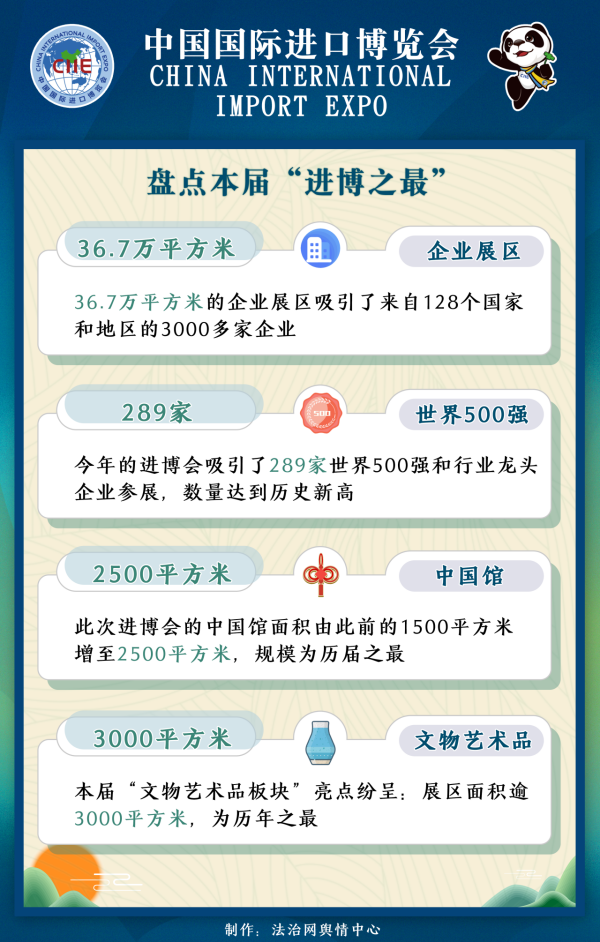 第六屆進(jìn)博會(huì)將創(chuàng)造多個(gè)“歷史之最”:今年進(jìn)博會(huì)企業(yè)展的展覽面積達(dá)到36.7萬平方米,吸引了128個(gè)國(guó)家和地區(qū)的3000多家企業(yè),規(guī)模為歷史之最;289家世界500強(qiáng)和行業(yè)龍頭企業(yè)參展,數(shù)量達(dá)到歷史新高;中國(guó)館升級(jí)擴(kuò)容,展覽面積由此前的1500平方米增至2500平方米,規(guī)模為歷屆之最;“文物藝術(shù)品板塊”的展區(qū)面積逾3000平方米,為歷屆之最。