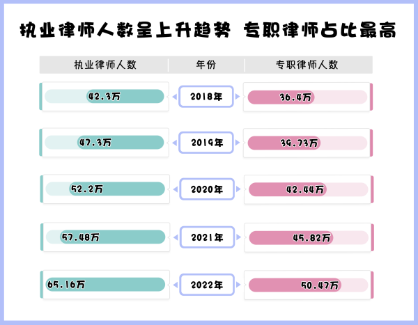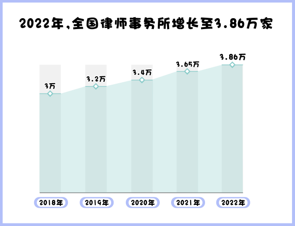 據(jù)司法部發(fā)布的官方數(shù)據(jù),截至2022年底,全國(guó)執(zhí)業(yè)律師已達(dá)65.16萬(wàn)多人,全國(guó)律師事務(wù)所數(shù)量已經(jīng)增長(zhǎng)至3.86萬(wàn)家,我國(guó)律師隊(duì)伍不斷壯大。