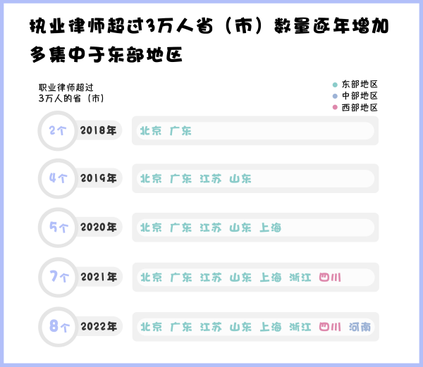 從司法部發(fā)布的數(shù)據(jù)來(lái)看,近五年來(lái),律師人數(shù)超過(guò)3萬(wàn)人的?。ㄊ校?shù)量持續(xù)上漲,截至2022年底,共有8個(gè)省(市)的律師人數(shù)超過(guò)3萬(wàn),其中除河南、四川外,其余?。ㄊ校┚植荚跂|部地區(qū)。