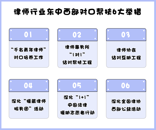 為有效推進(jìn)律師行業(yè)東中西部對(duì)口幫扶工作,《關(guān)于建立健全律師行業(yè)東中西部對(duì)口幫扶機(jī)制的方案》列舉了如下措施。