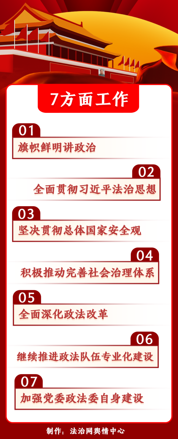 會(huì)議要求抓好七方面工作:旗幟鮮明講政治;全面貫徹習(xí)近平法治思想;堅(jiān)決貫徹總體國(guó)家安全觀(guān);積極推動(dòng)完善社會(huì)治理體系;全面深化政法改革;持續(xù)推進(jìn)政法隊(duì)伍專(zhuān)業(yè)化建設(shè);加強(qiáng)黨委政法委自身建設(shè)。