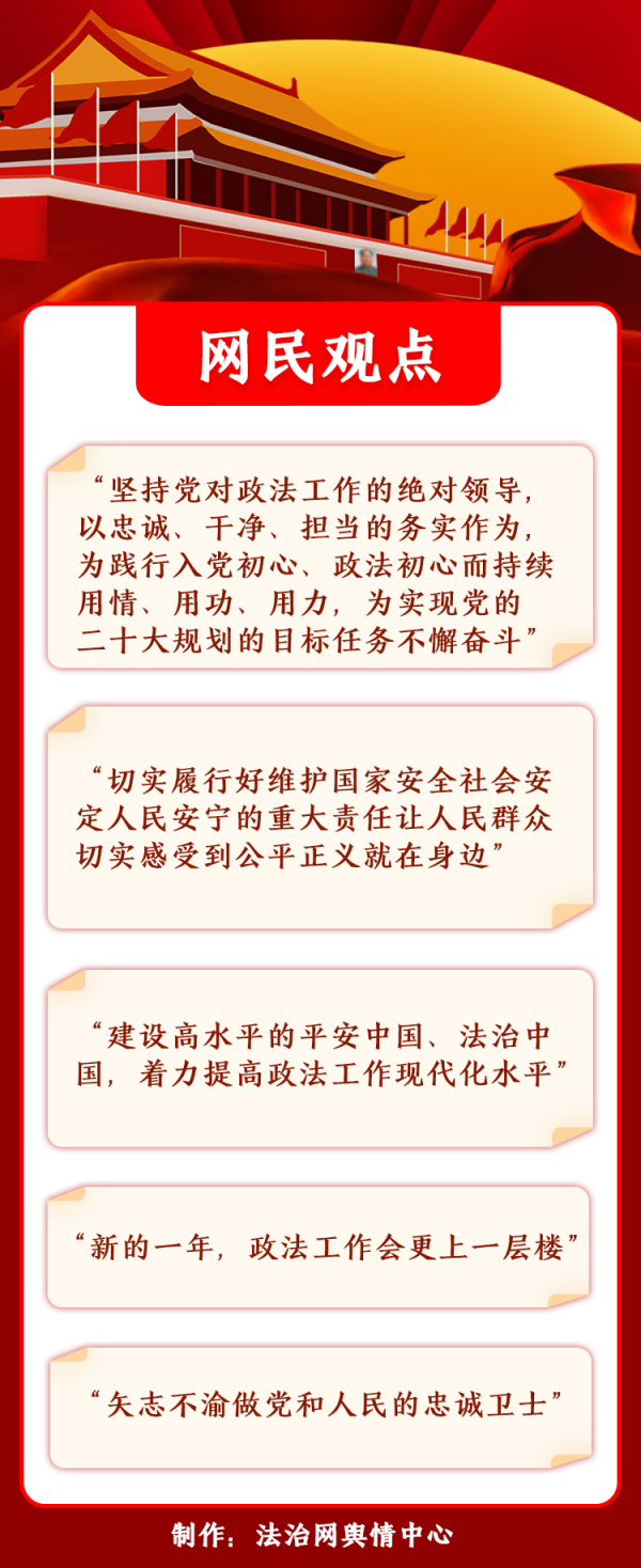 網(wǎng)民期待開(kāi)啟新時(shí)代政法工作發(fā)展新篇章。不少網(wǎng)民在“中央政法委長(zhǎng)安劍”等政法機(jī)關(guān)官微留言,認(rèn)為會(huì)議對(duì)政法工作的重要部署句句關(guān)于公正、深入人心。多數(shù)網(wǎng)民對(duì)全國(guó)政法機(jī)關(guān)有效維護(hù)國(guó)家安全、社會(huì)安定、人民安寧的付出表示感謝,期待推進(jìn)建設(shè)更高水平的平安中國(guó)、法治中國(guó);部分網(wǎng)民向守護(hù)公平正義、維護(hù)社會(huì)穩(wěn)定而犧牲的政法干警致敬;少數(shù)網(wǎng)民結(jié)合政法系統(tǒng)違紀(jì)違法典型案例,呼吁在從嚴(yán)正風(fēng)肅紀(jì)上緊抓不放,建設(shè)高素質(zhì)政法鐵軍。