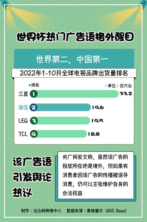 本屆世界杯不乏中國元素,其中,海信“中國第一,世界第二”的廣告語引發(fā)了輿論熱議。而熱議的焦點(diǎn),一方面在于廣告語中的排名是否有據(jù)可循;另一方面,該標(biāo)語是否涉嫌違法。