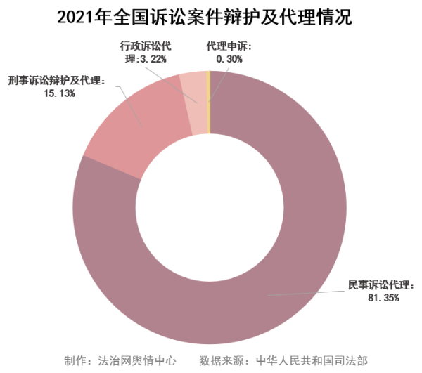 在律師辦理的811.6萬(wàn)多件訴訟案件中,刑事訴訟辯護(hù)及代理122.8萬(wàn)多件,占訴訟案件的15.13%;民事訴訟代理660.1萬(wàn)多件,占訴訟案件的81.35%;行政訴訟代理26.2萬(wàn)多件,占訴訟案件的3.22%;代理申訴2.4萬(wàn)多件,占訴訟案件的0.30%。