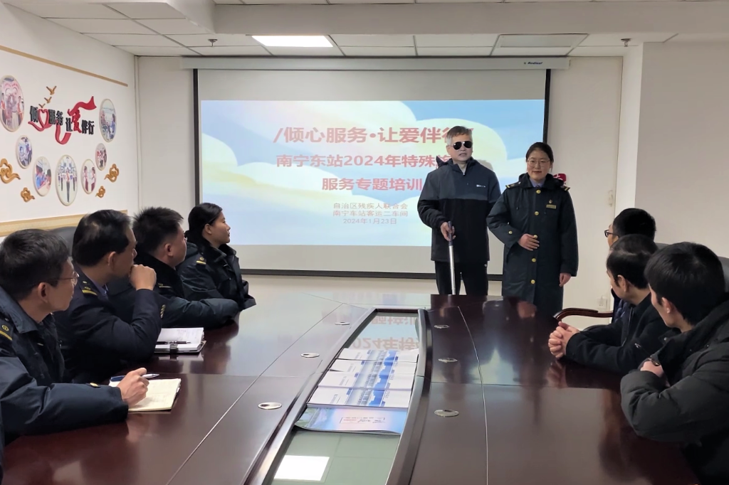 春運(yùn)大幕開啟前,在南寧東站上演了一場特殊的培訓(xùn)課。特殊的是,培訓(xùn)老師是一位視力障礙旅客,他拄著盲棍示意,將與視力障礙人士相處的注意事項(xiàng)一一道來,并帶領(lǐng)培訓(xùn)學(xué)員在車站內(nèi)進(jìn)行了實(shí)踐。而參加培訓(xùn)的學(xué)員,是一支由10名客運(yùn)員組成的南寧東站“幫幫盲”團(tuán)隊(duì)。