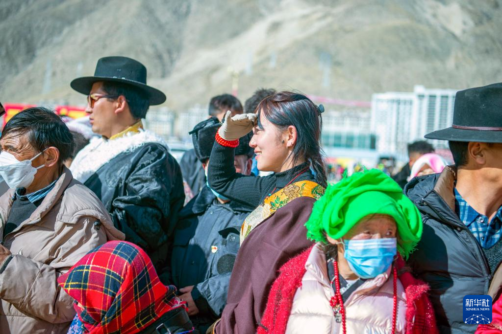 丹增(中)在森布日生態(tài)搬遷安置點觀看賽馬活動(1月24日攝)。