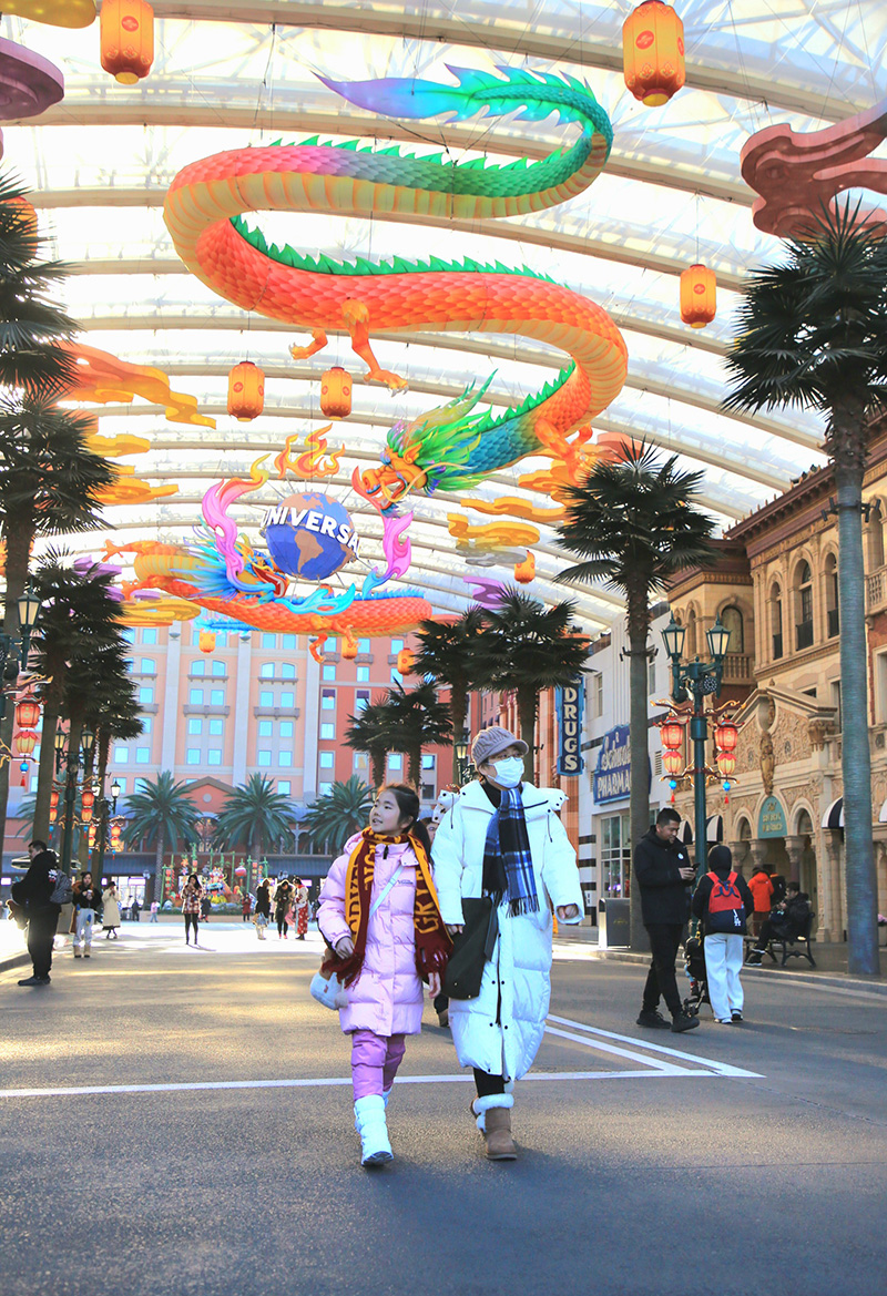 1月27日,也是北京環(huán)球度假區(qū)開(kāi)啟“環(huán)球中國(guó)年”主題活動(dòng)首日,眾多游客前來(lái)打卡,記者在現(xiàn)場(chǎng)看到,在全新的環(huán)球新春廣場(chǎng),“年來(lái)啦”特別演出上演新春大聯(lián)歡,環(huán)球新春廣場(chǎng)集市包羅萬(wàn)象,火熱新年味正濃。來(lái)自照明娛樂(lè)的小黃人、來(lái)自夢(mèng)工場(chǎng)動(dòng)畫(huà)《馬達(dá)加斯加》的朱利安國(guó)王、阿歷克斯和歌莉雅,以及阿寶、悍嬌虎和美美等十余位大片世界明星角色和約50名演員一起,以“驅(qū)趕年獸歡度春節(jié)”為故事線(xiàn),帶游客回歸熱鬧的過(guò)年場(chǎng)景。