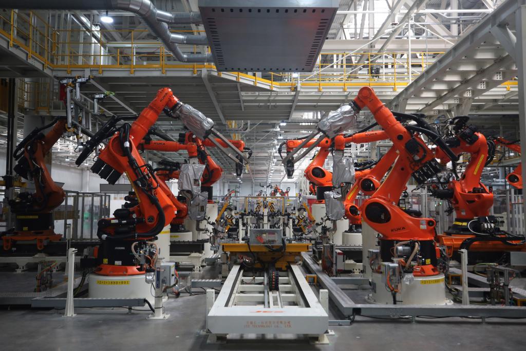 大眾安徽模塊化電驅(qū)動(dòng)平臺(tái)工廠車身車間一角。(2023年5月29日攝)新華社記者 杜瀟逸 攝