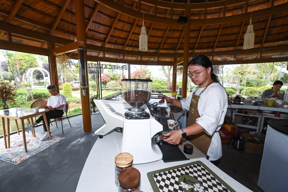 工作人員在浙江湖州織里鎮(zhèn)伍浦村漁耕文化園的陶灣里鄉(xiāng)村咖啡店工作。新華社記者徐昱 攝
