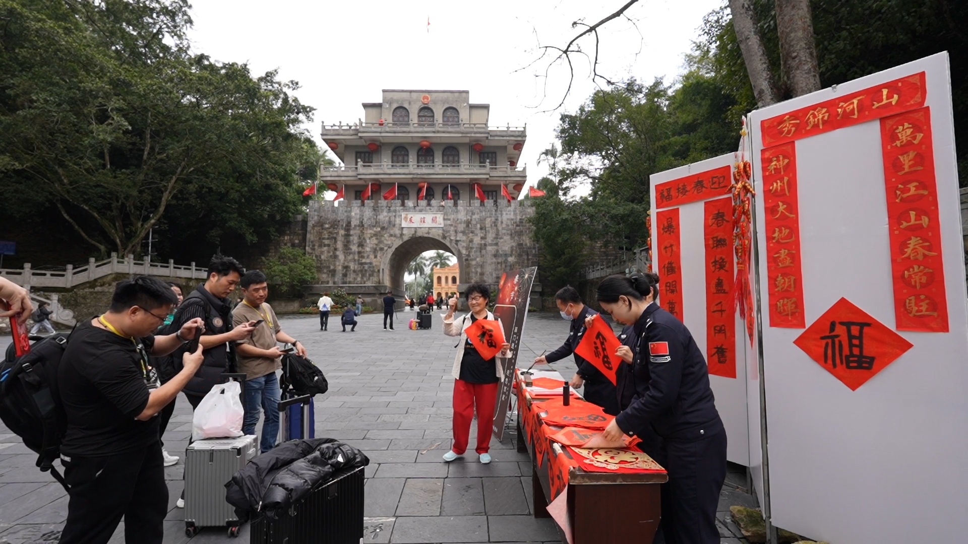 2月2日9時,千年雄關友誼關前人頭攢動,出入境旅客絡繹不絕,一片熱鬧的景象。廣西出入境邊防檢查總站友誼關出入境邊防檢查站移民管理警察在此為廣大旅客寫對聯(lián)送福字。
