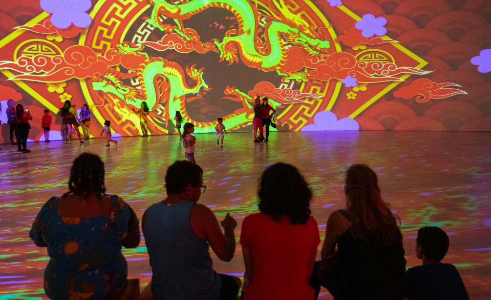 夜幕降臨,燈光秀上演。公園內(nèi)的路易斯門(mén)東薩劇院外墻上騰起金色巨龍的燈光秀,龍年拜年娃娃、二十四節(jié)氣隨后展現(xiàn),之后在劇院的舞臺(tái)上來(lái)自圣保羅唐韻藝術(shù)團(tuán)的演員們帶來(lái)中國(guó)特色舞蹈。