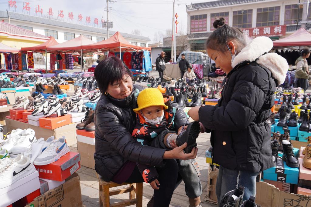 1月17日,甘肅省臨夏州積石山縣石塬鎮(zhèn)村民在集市上買鞋。新華社記者 馬希平 攝