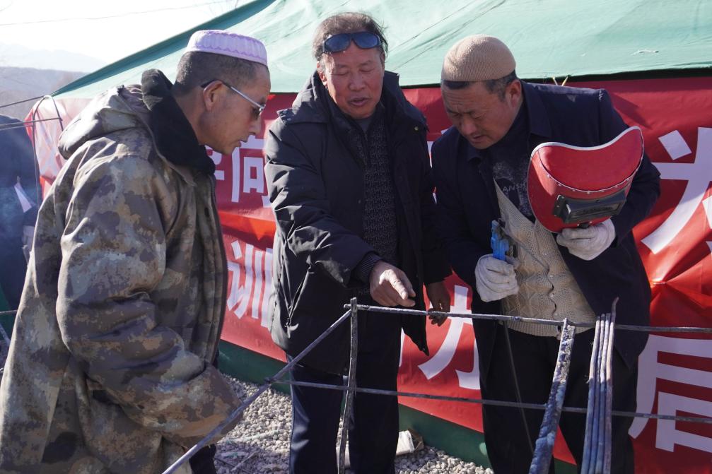 1月16日,在甘肅省臨夏州積石山縣大河家鎮(zhèn)陳家村安置點,群眾參加電焊技能培訓(xùn)班。新華社記者 馬希平 攝