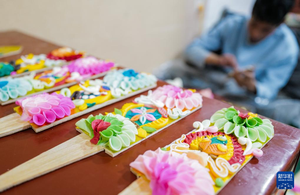 2月7日,在拉薩八廓商城,手工藝人在制作酥油花。