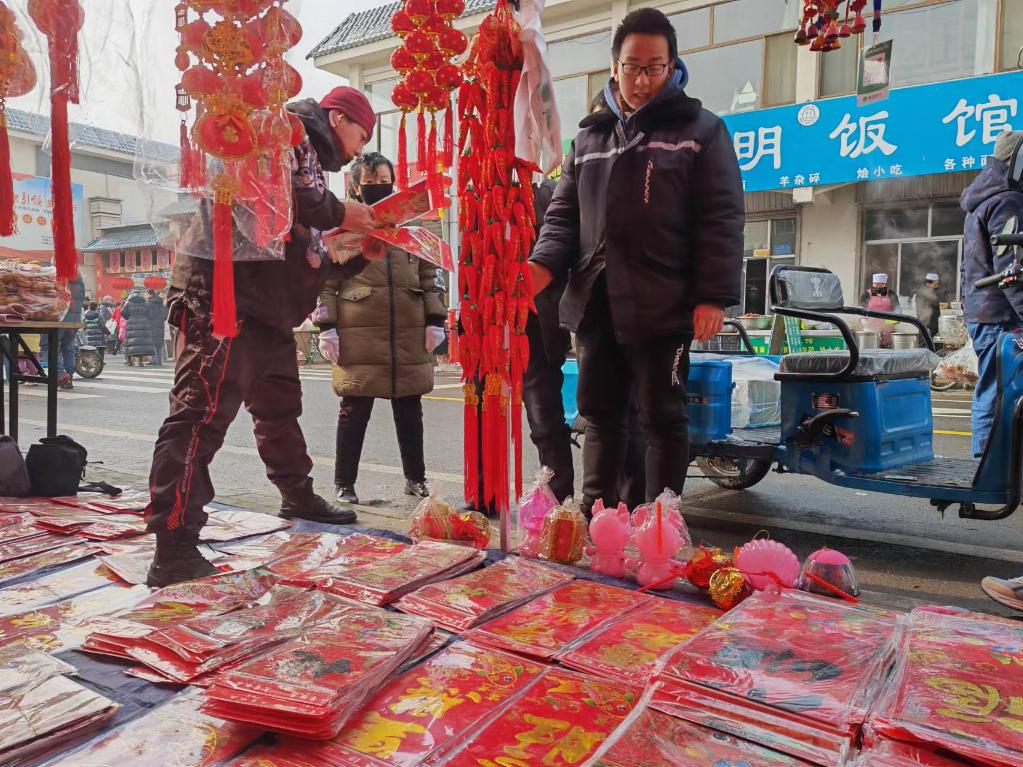 “每年小年一過,這大集是越趕越紅火。貼春聯(lián)是傳統(tǒng)年俗,家家戶戶都要買?!碧锸所i說著,為自家也選定了一副:萬事如意財運來,新春大吉福門開?!靶碌囊荒辏筘?、求運、求福?!彼Φ馈3鰯傄簧衔?,這位42歲的攤主在收付款到賬聲中忙得不亦樂乎。