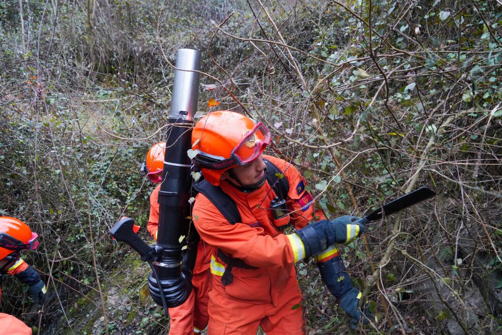 森林消防員利用砍刀開(kāi)辟前進(jìn)道路。(甘肅省森林消防總隊(duì)供圖)