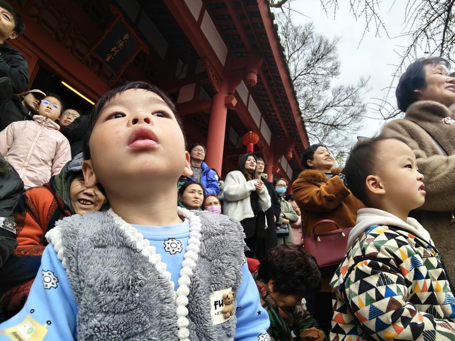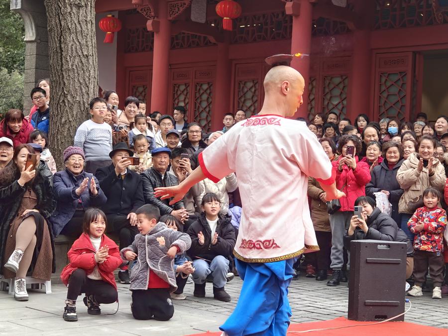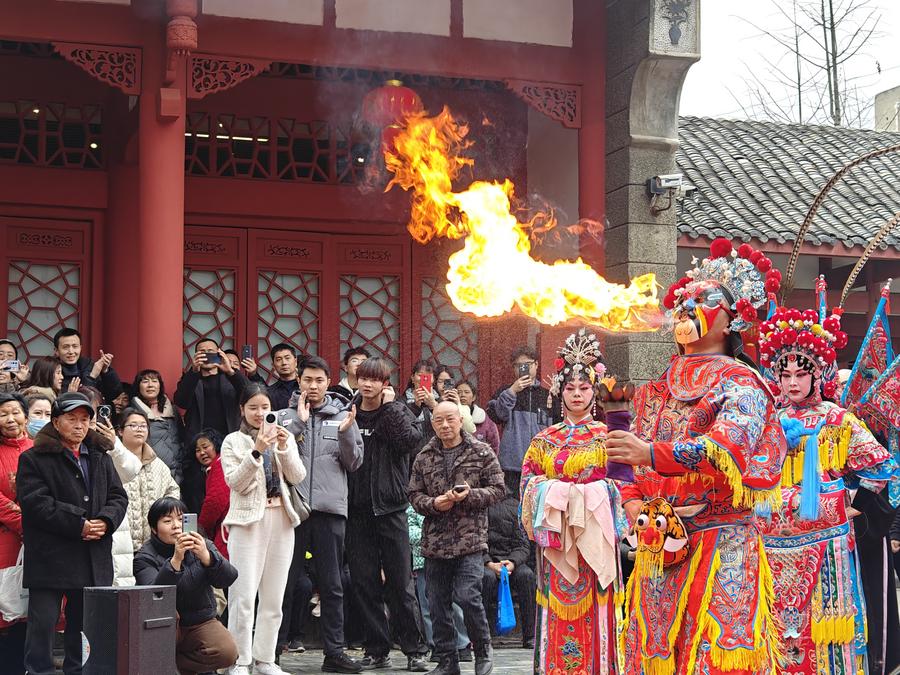 2月14日,川漢劇團(tuán)演員為市民表演吐火。新華社記者謝佼 攝