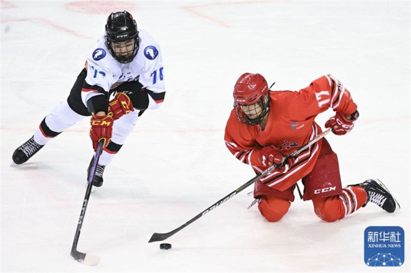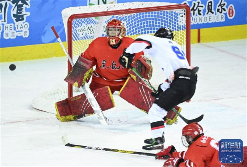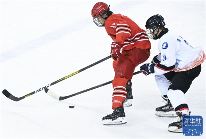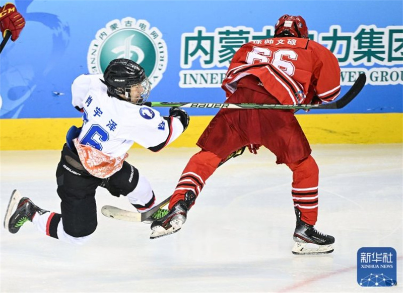 2月18日,在內(nèi)蒙古冰上運(yùn)動(dòng)訓(xùn)練中心冰球館舉行的第十四屆全國(guó)冬季運(yùn)動(dòng)會(huì)冰球項(xiàng)目男子青年組小組循環(huán)賽A組比賽中,北京隊(duì)5比1戰(zhàn)勝黑龍江隊(duì)。