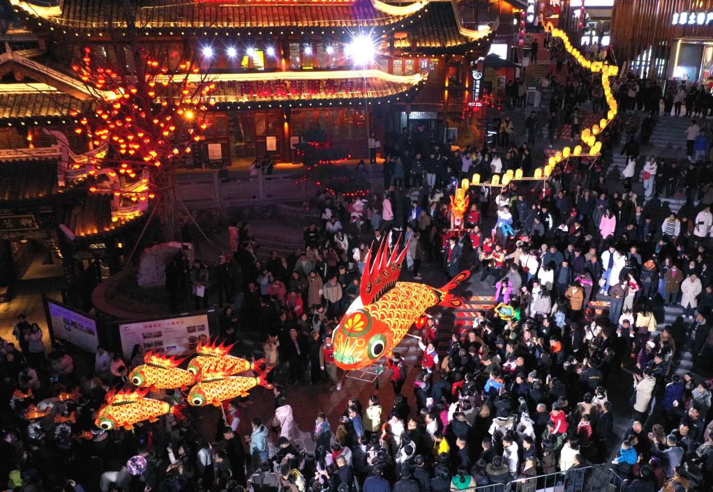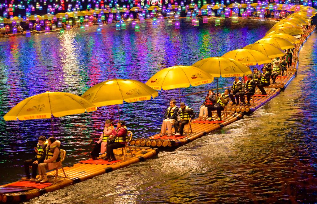 烤活魚(yú)一條街旁的河道里,花船載歌載舞,首尾相連的竹筏宛若游龍?jiān)诤拥乐序暄亚靶??!褒堄呜曀碧厣^光項(xiàng)目吸引了不少游客佇立岸邊“看稀奇”。