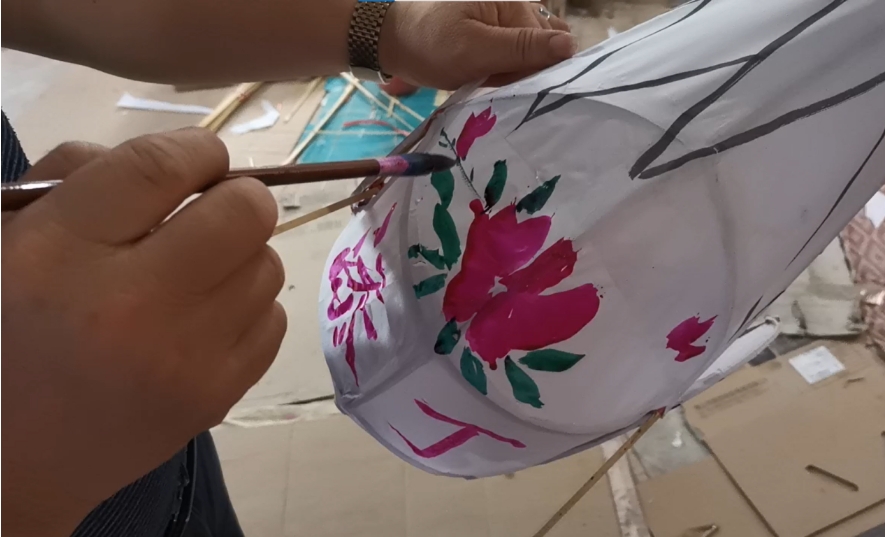 周芙明常用紅、綠、藍(lán)、黃幾種顏色。這樣畫出來的燈籠五彩斑斕,很是醒目。上好色、晾曬好的燈籠仍然少頭缺尾,此時(shí)再用彩帶纏至“雞尾”,糊上用紙做成的“雞冠”,這才算是大功告成。