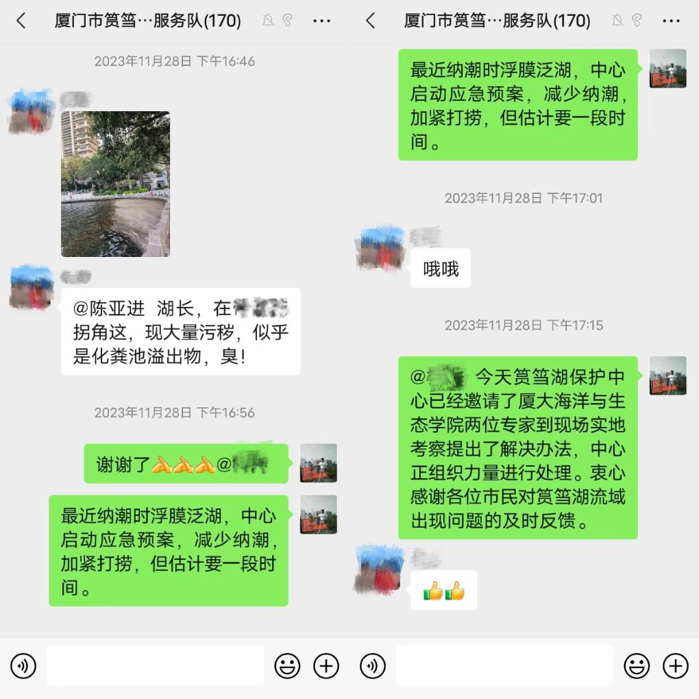 “你看,微信群里有人反映小區(qū)門口的湖水里有疑似化糞池溢出物,我們核實后啟動了應(yīng)急預(yù)案,筼筜湖保護中心邀請專家實地考察后給出了解決方案?!标悂嗊M(jìn)指著手機屏幕向記者介紹道。在這個名為“廈門市筼筜藍(lán)志愿服務(wù)隊”的微信群中,時不時有人@湖長反映問題,“這些都是我們志愿服務(wù)隊的骨干,他們發(fā)現(xiàn)問題就@我,我上報給筼筜湖保護中心,由他們來解決問題?!?/p>