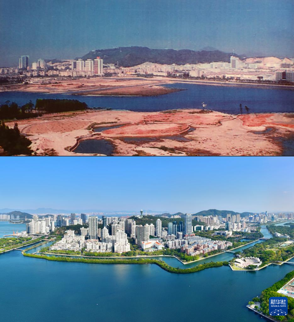 拼版照片:上圖為20世紀80年代的廈門筼筜湖(資料照片);下圖為2024年1月24日拍攝的廈門筼筜湖及周邊城市景觀(新華社記者姜克紅攝,無人機照片)。
