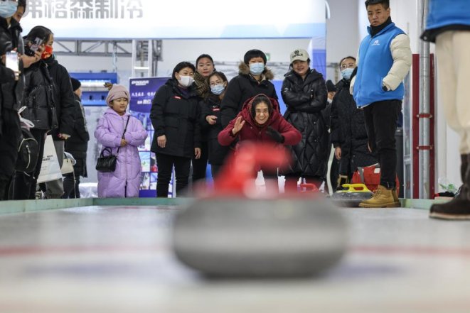 2023年12月16日,市民在首屆呼倫貝爾·海拉爾冰雪產(chǎn)品冬季展銷會上體驗(yàn)冰壺。新華社記者 王楷焱 攝