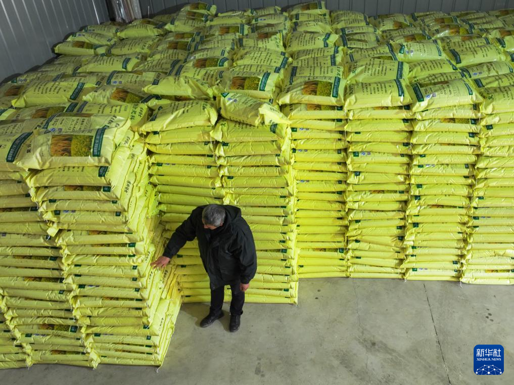 2月25日,在湖南省益陽(yáng)市赫山區(qū)農(nóng)田謀士水稻專業(yè)合作社,工作人員在查看復(fù)合肥料儲(chǔ)備情況(無(wú)人機(jī)照片)。