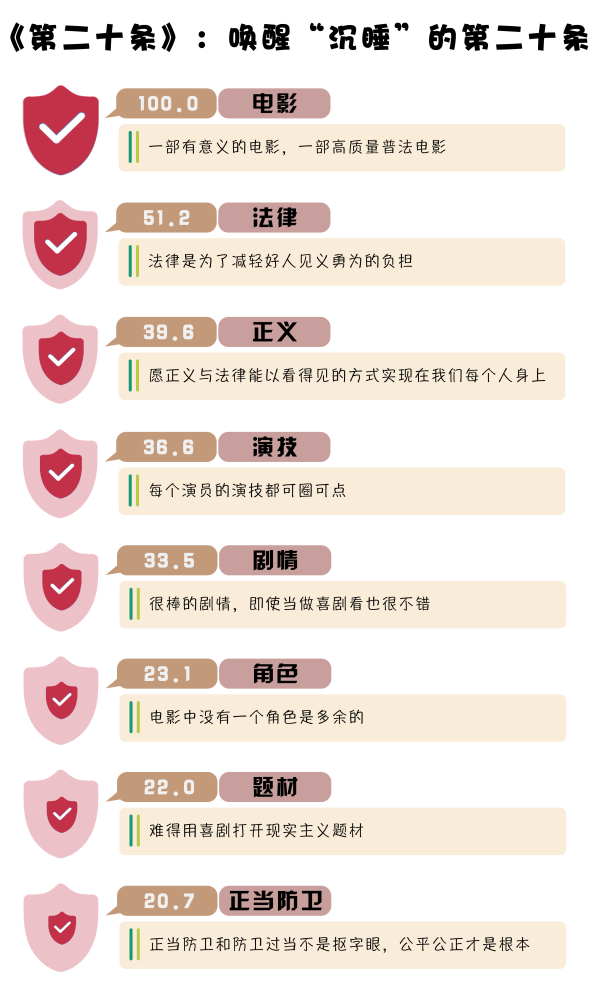 (制作:法治網(wǎng)輿情中心 數(shù)據(jù)來源:豆瓣 注:選取《第二十條》的部分豆瓣短評,對所選取的短評做NLP分詞處理,對詞語做歸一化處理,將頻度最高的詞語規(guī)定為100)