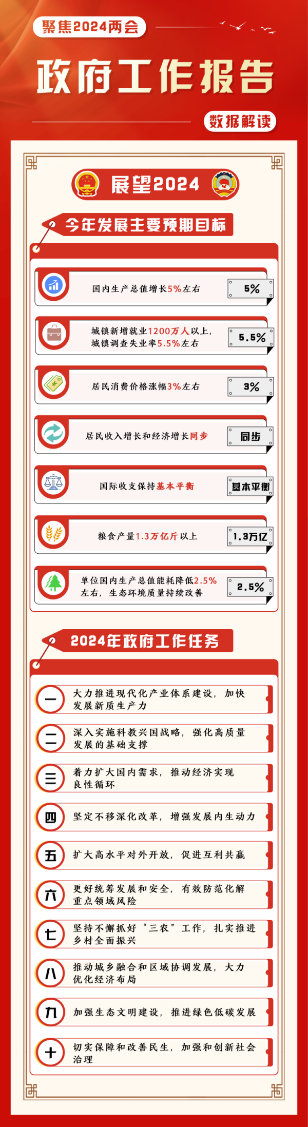 (制作:法治網(wǎng)輿情中心 數(shù)據(jù)來源:新華社微博:《一圖速覽2024年政府工作報(bào)告》;中國(guó)新聞網(wǎng):《事關(guān)你我!30句話讀懂政府工作報(bào)告》)