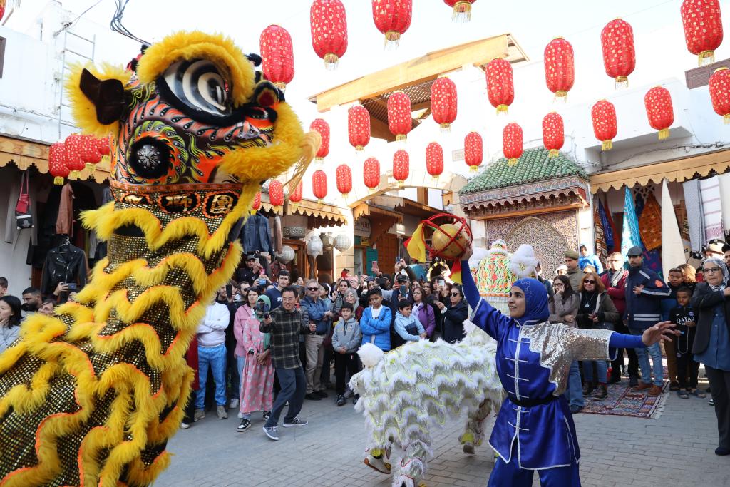 1月22日,人們?cè)谀β甯缡锥祭吞乩铣抢镉^看舞獅表演。當(dāng)日,由中國(guó)文化和旅游部、中國(guó)駐摩洛哥大使館主辦的2024摩洛哥“歡樂(lè)春節(jié)·中國(guó)廟會(huì)”活動(dòng)在摩洛哥首都拉巴特開(kāi)幕,迎接即將到來(lái)的中國(guó)農(nóng)歷龍年春節(jié)。新華社記者 霍晶 攝