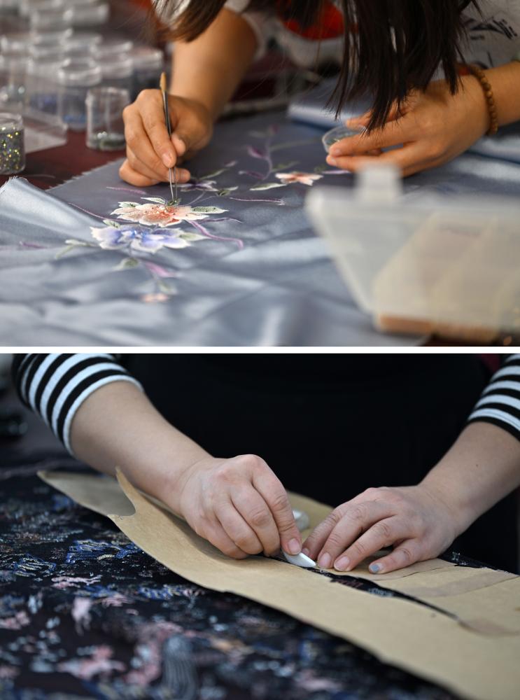 拼版照片:上圖為老美華定制車間的制衣師傅在面料上貼鉆;下圖為老美華定制車間的制衣師傅在面料上劃線(2023年12月8日攝)。天津老美華始創(chuàng)于1911年,歷史上以“千層底”布鞋聞名,是享譽津門的“中華老字號”。新華社記者 李然 攝