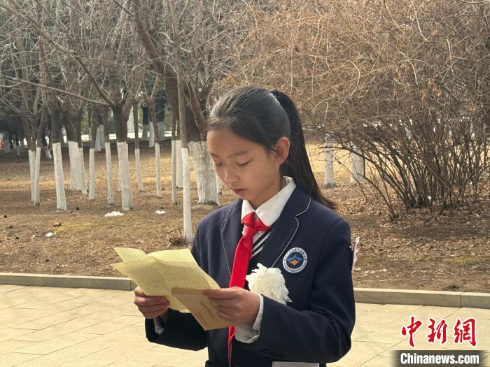 沈陽市寧山路小學學生在烈士墓碑前朗讀信件。李伶俐 攝
