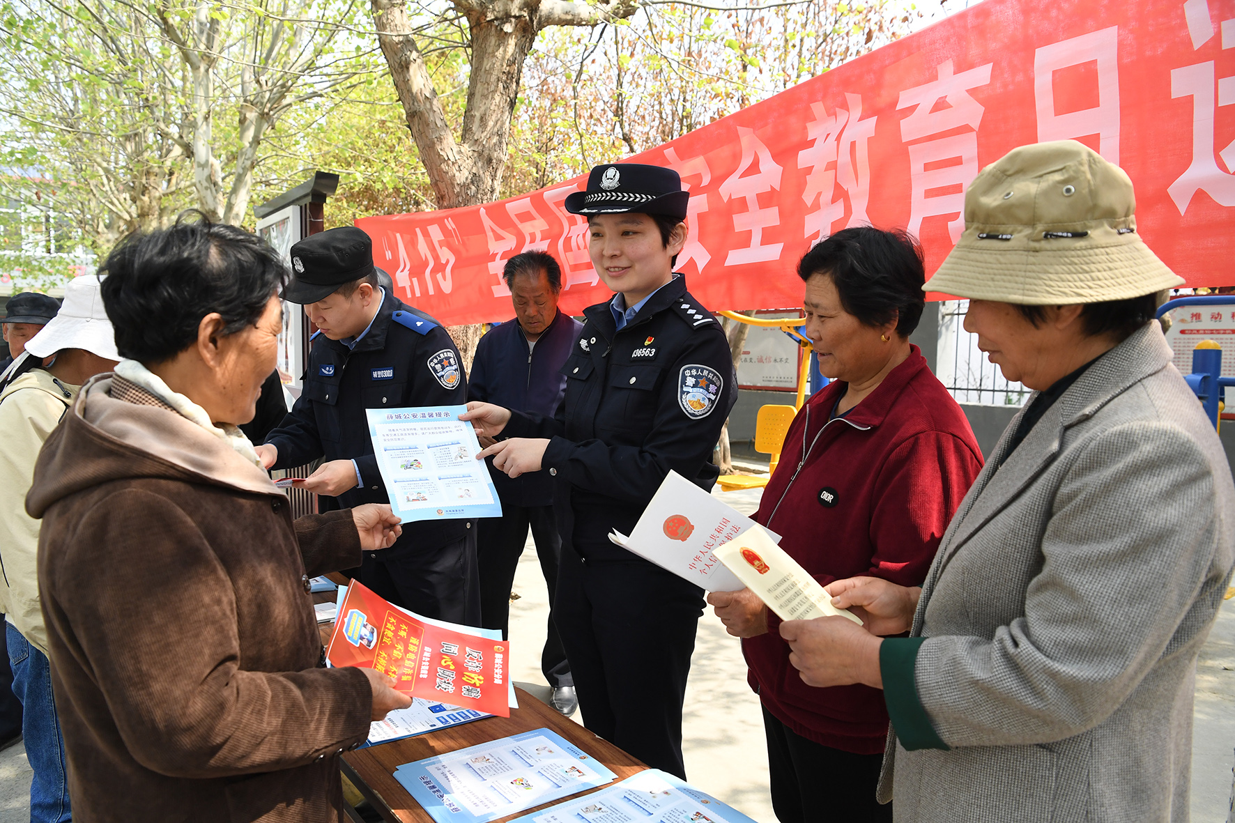 4月11日,山東省棗莊市公安局薛城分局鳳鳴湖派出所民輔警在轄區(qū)高樓社區(qū)全民國家安全教育日宣傳活動。