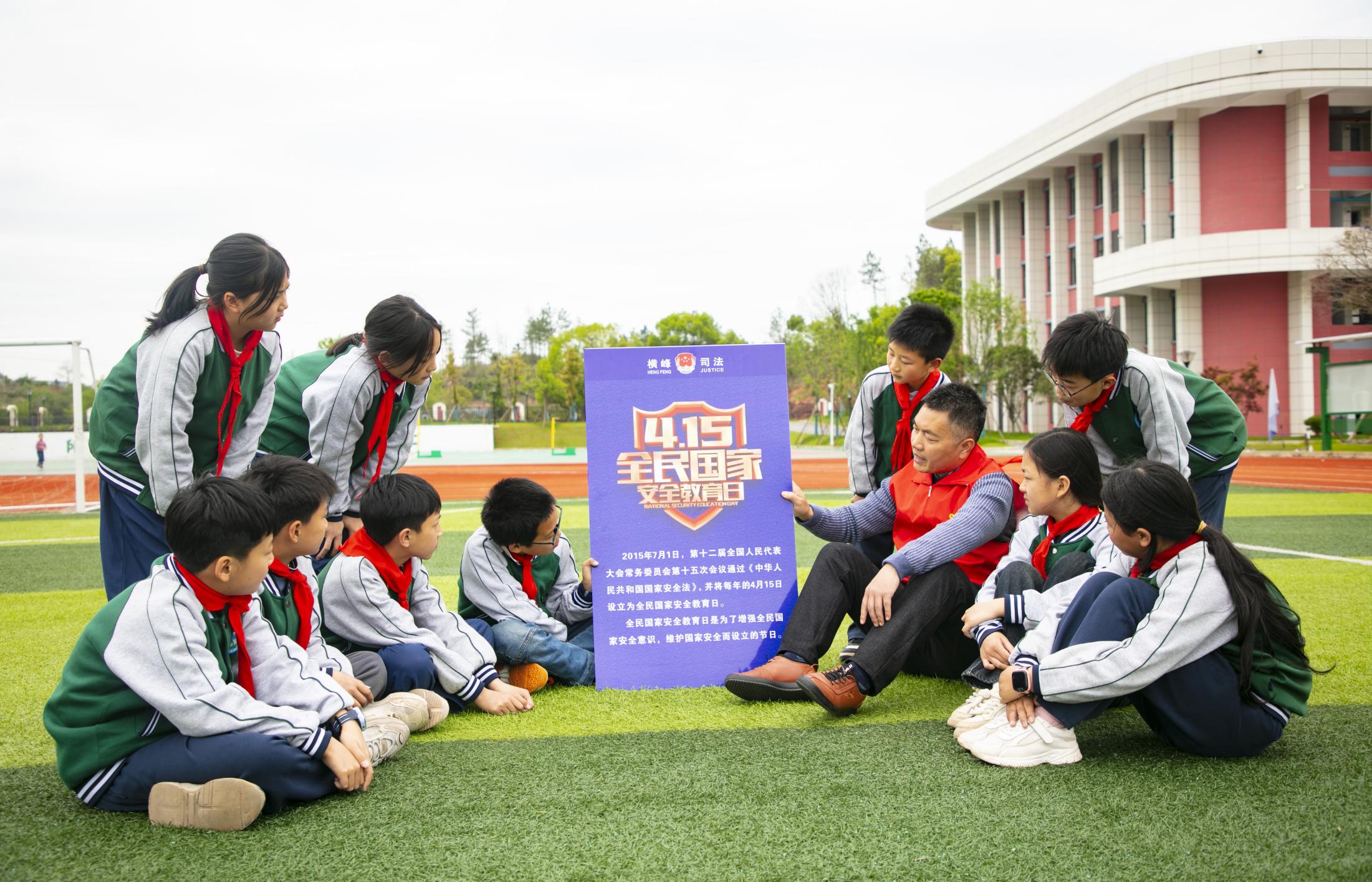 在第九個全民國家安全教育日到來之際,江西省上饒市橫峰縣司法局組織平安志愿者前往轄區(qū)校園開展國家安全教育知識宣講,不斷增強青少年的國家安全意識和法治意識,共筑國家安全防線。圖為4月10日,平安志愿者在橫峰縣第三小學為同學們講解國家安全知識。