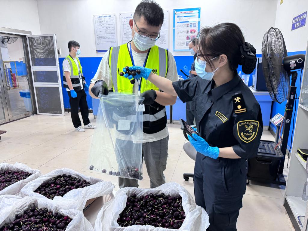 廣州白云機場海關(guān)關(guān)員對新產(chǎn)季進(jìn)口車?yán)遄舆M(jìn)行監(jiān)管。(受訪者供圖)