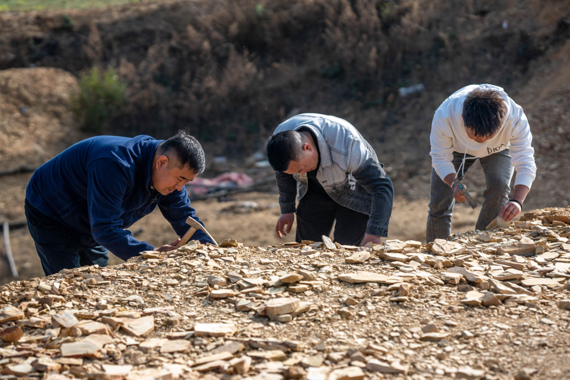 全國(guó)人大代表郭進(jìn)(左一)在野外進(jìn)行化石零星采集。