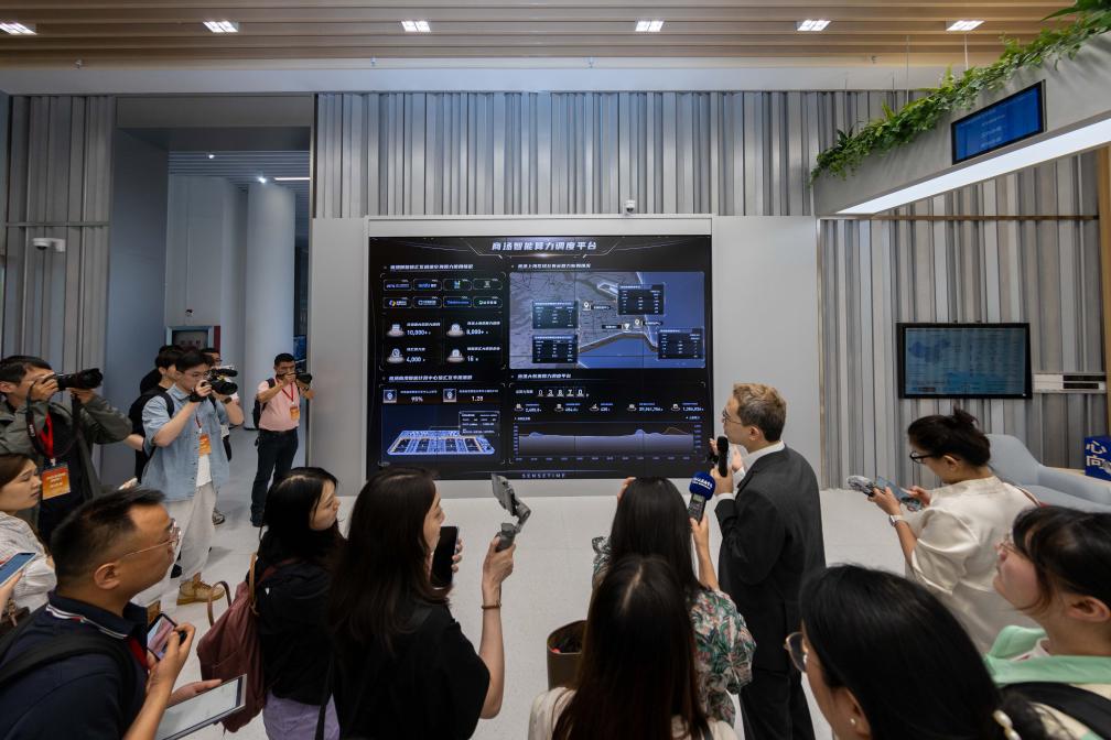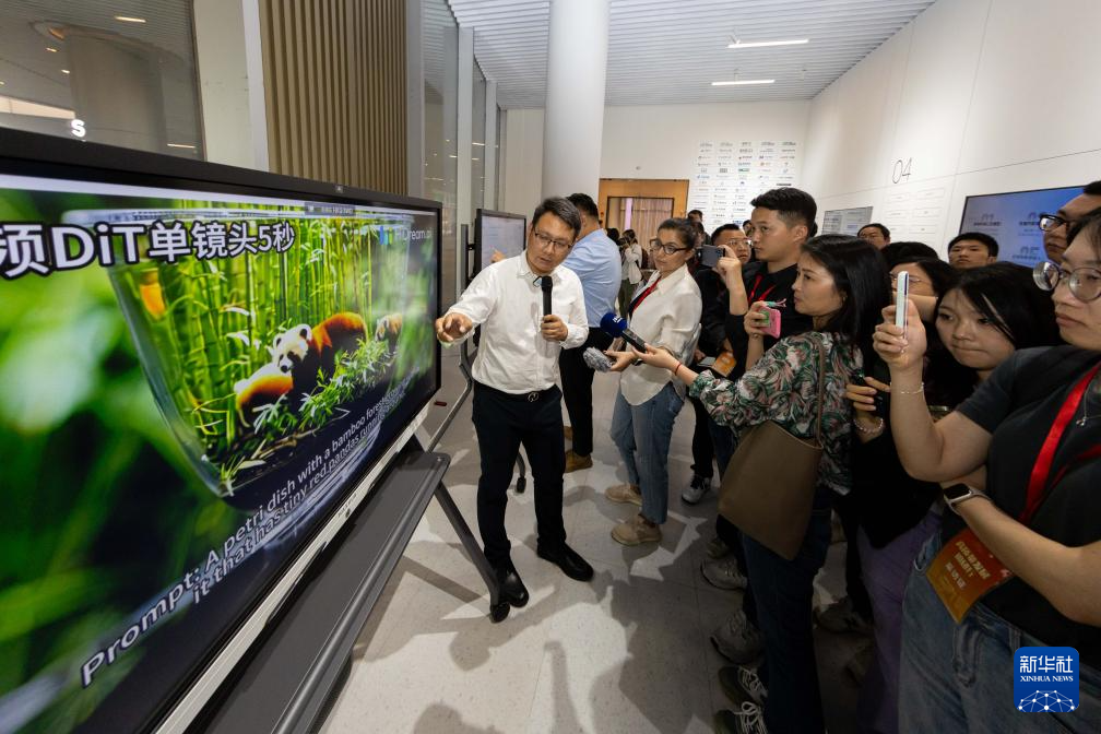 5月23日,大模型企業(yè)、智象未來生態(tài)合作部總經(jīng)理沈偉峰為采訪團(tuán)介紹運(yùn)用大模型文生視頻。新華社記者 王翔 攝