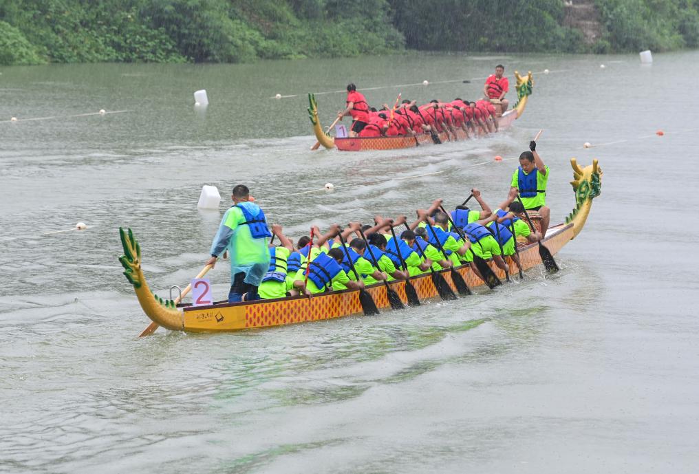 5月29日,在酉陽(yáng)縣龍?zhí)舵?zhèn),龍舟隊(duì)在水面角逐。
