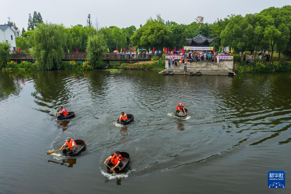 5月25日,村民們參加水鄉(xiāng)劃菱桶比賽。菱桶是河網(wǎng)密布的東林鎮(zhèn)百姓家中常見(jiàn)的一種傳統(tǒng)水上勞動(dòng)工具,村民在捕魚(yú)、采菱、采荷時(shí)都要用到(無(wú)人機(jī)照片)。